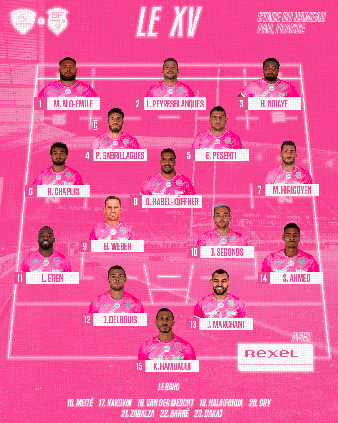 Découvrez les 23 Parisiens qui défieront la Section Paloise au Stade du Hameau. Coup d’envoi ce samedi 25 novembre à 17:00 !